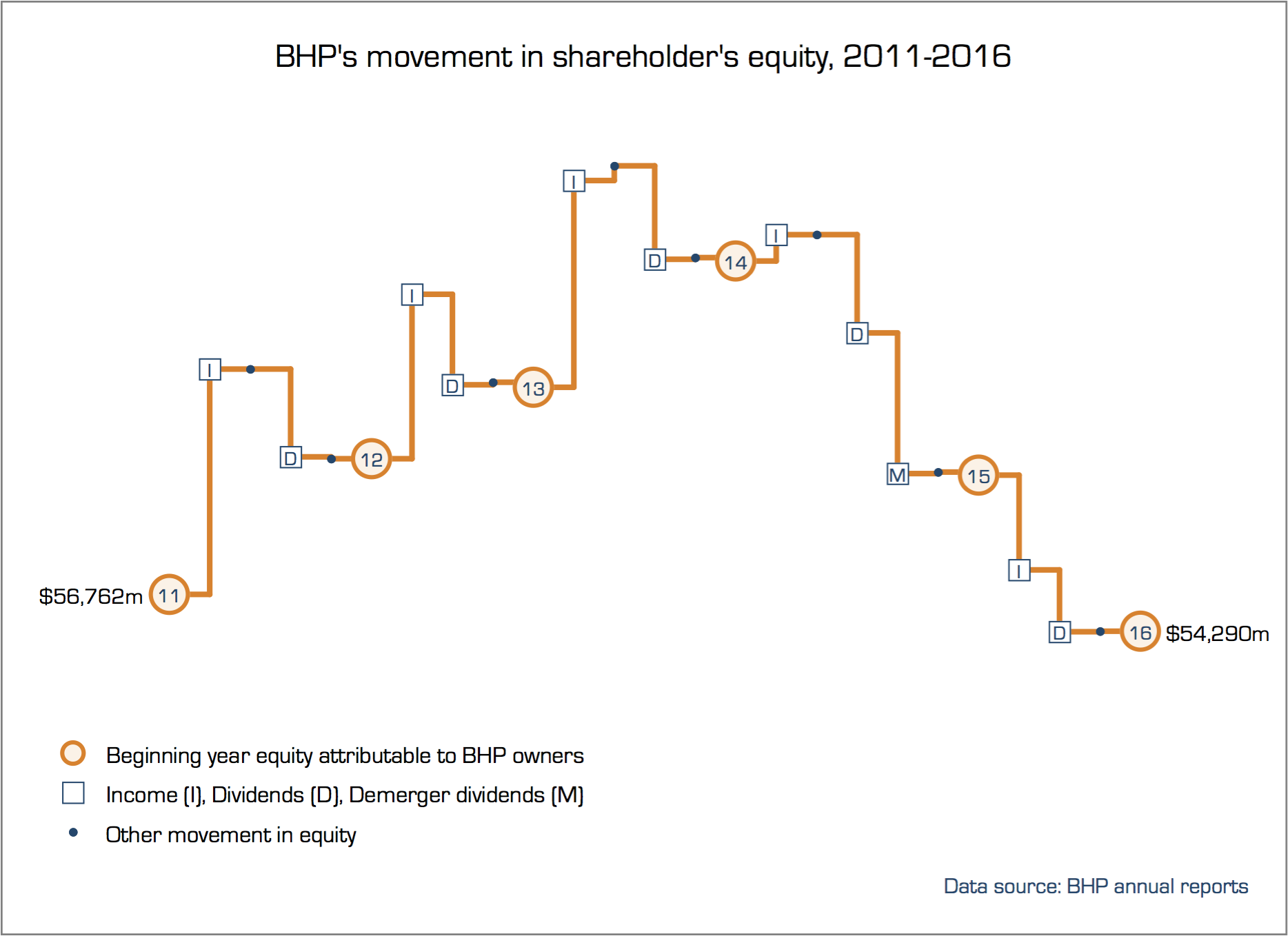 It is now evident that BHP’s equity has suffered as a result of the demerger event in 2014 and continued to fall in 2015, reaching a level in 2016 that is in fact lower than 2011.