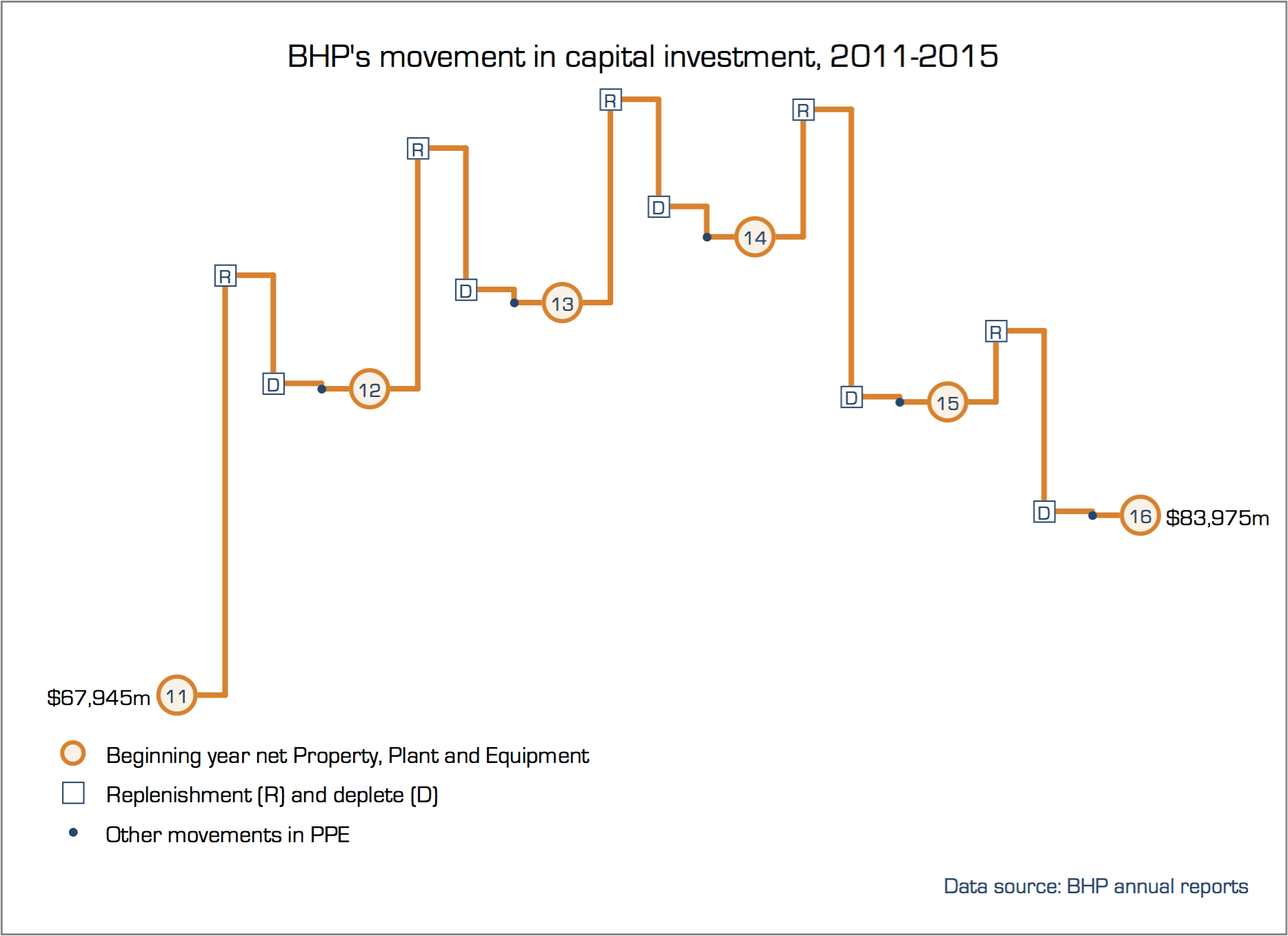 The proposed solution to the graph objective demonstrates the accumulation of capital investment for BHP from about AU$67 billion in 2011 to about AU$83 billion in 2016, through a schedule of net capital replenishment during 2011-2014 followed by net capital depletion during 2014-2015. The steep depletion of capital during 2014 (nearly twice as large as the replenishment in 2014) was due to a demerger event, and raises the question on the consequences to equity investment.