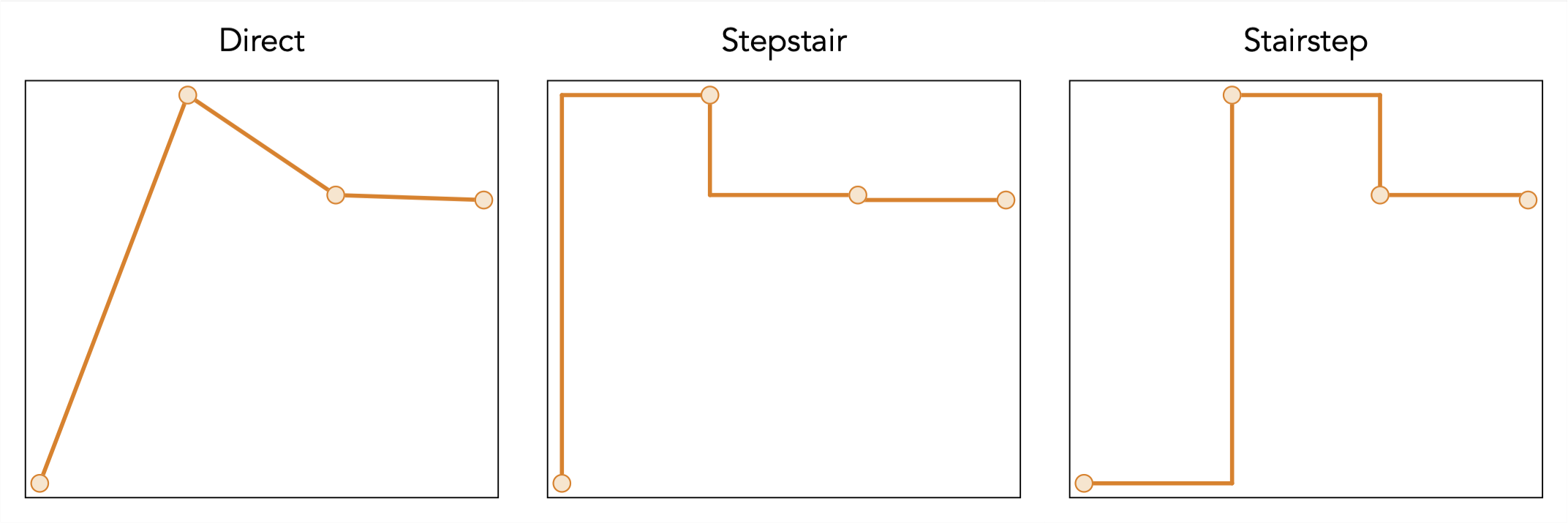 For this graph objective, the information implied by the angled lines would be misleading as they suggest continuity along the x-axis. The x-axis is in fact artificial, it simply represents an equidistant index with no particular meaning. Also, direct connection would imply varying degree of steepness in flows that could mislead too.