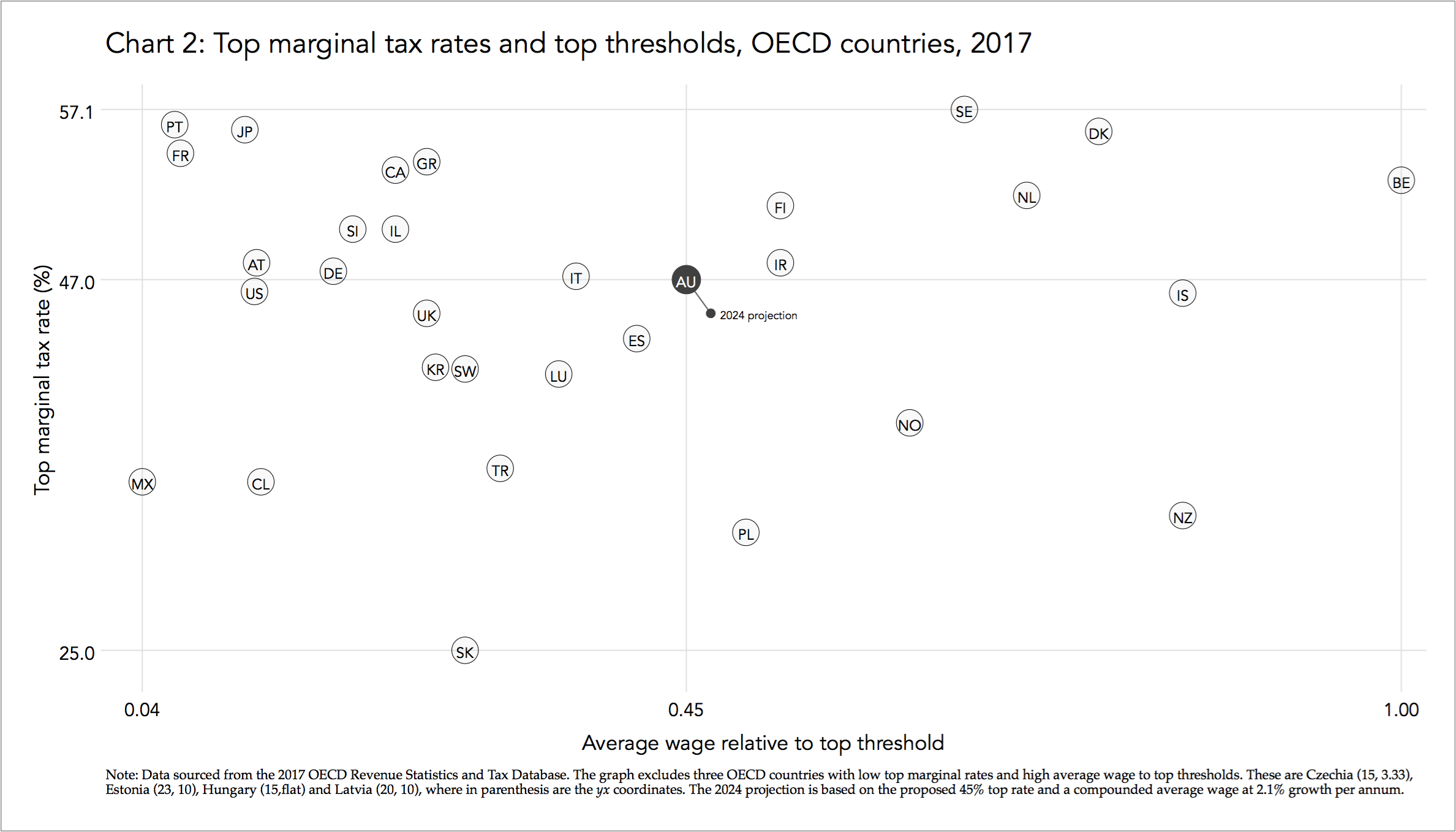 External identification encodes the values of the coordinates for Australia of those countries with the most extreme values in the sample; these are shown as axes labels. As usual, external identification includes a graph title describing the relation between top marginal rates and top thresholds for the sample of OECD countries in 2017.