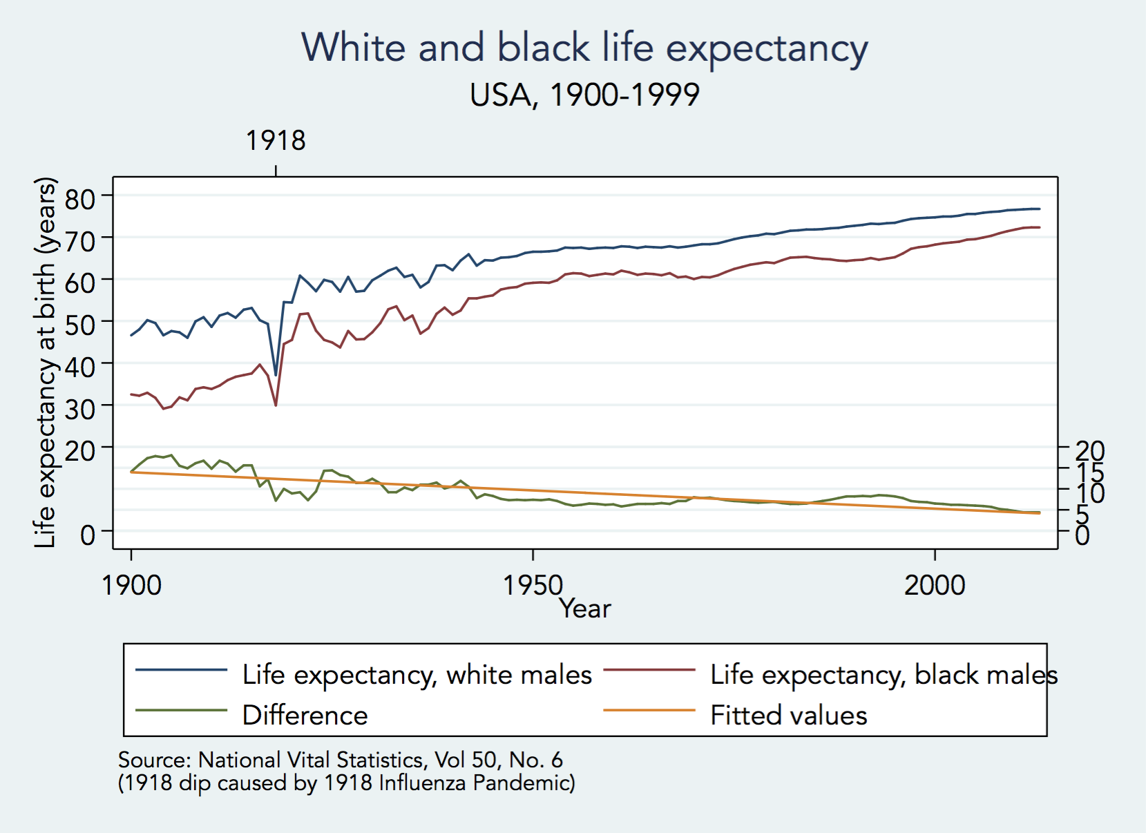 The graph objective is to report the time evolution of US life expectancy for black and white males, up to date. In the graph above, the linear fit on the difference in life expectancy is quite misleading as it suggests elimination and eventual reversal of the difference in life expectancy between white and black males.