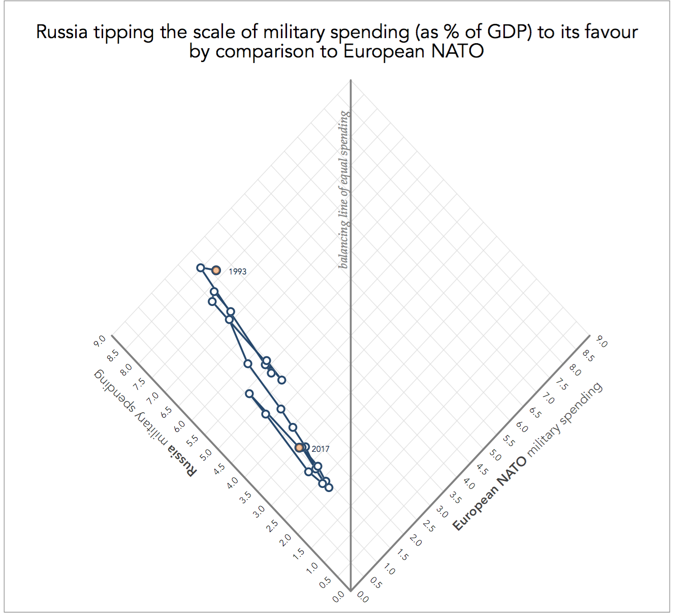 The vertical reference line (what used to be the 45 degree line) is identified as the “balancing line of equal spending”, thus making it clear that Russia has heavily imbalanced limitary spending by comparison to European NATO.