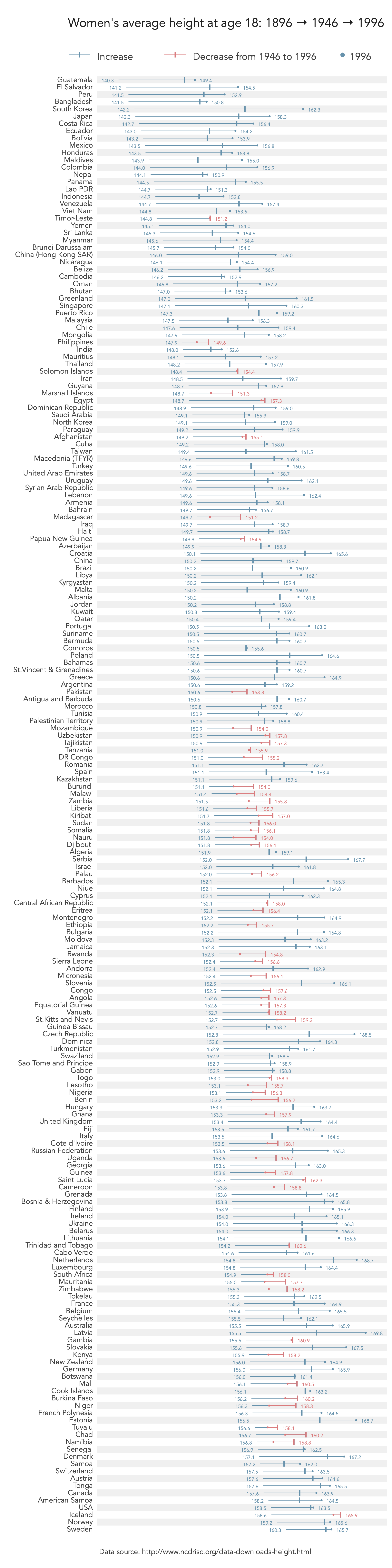 I directly identify all country-specific values of heights in 1896 and in 1996. This means that where there are decreases in height from 1946 to 1996 (the red lines and markers), the identified values in the right hand side are representative of 1996 whereas for decreases is it the marker that is shown in the middle of the line. I acknowledge that this is a non-intuitive form of identification that could confuse decoding and I am open to suggestions for improvement.