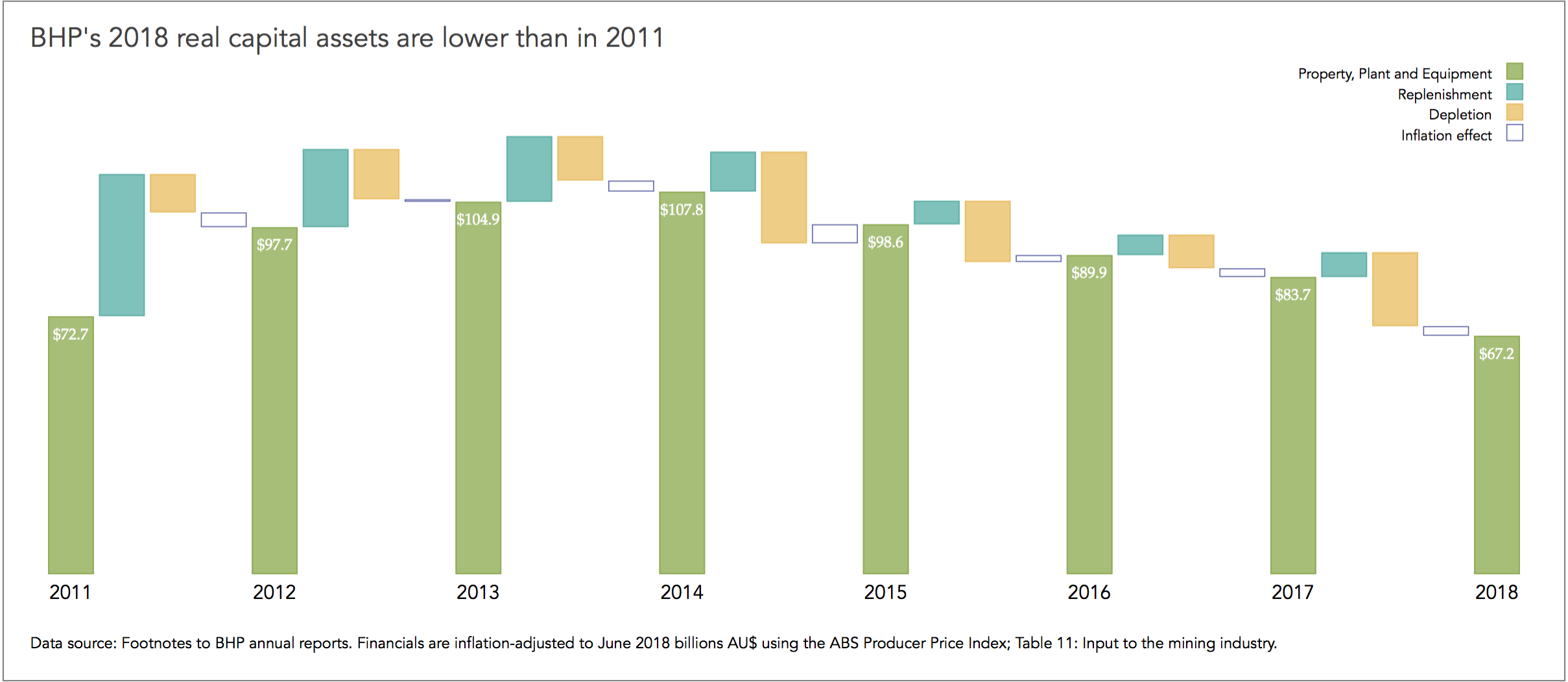 The data on financials is observed from BHP’s annual reports 2011-2018. I adjust the data presented in BHP’s real capital stock-and-flow movement to have only three periodic flows: overall replenishment, depletion, and the effect of inflation adjustment. Then, I merge the two datasets.