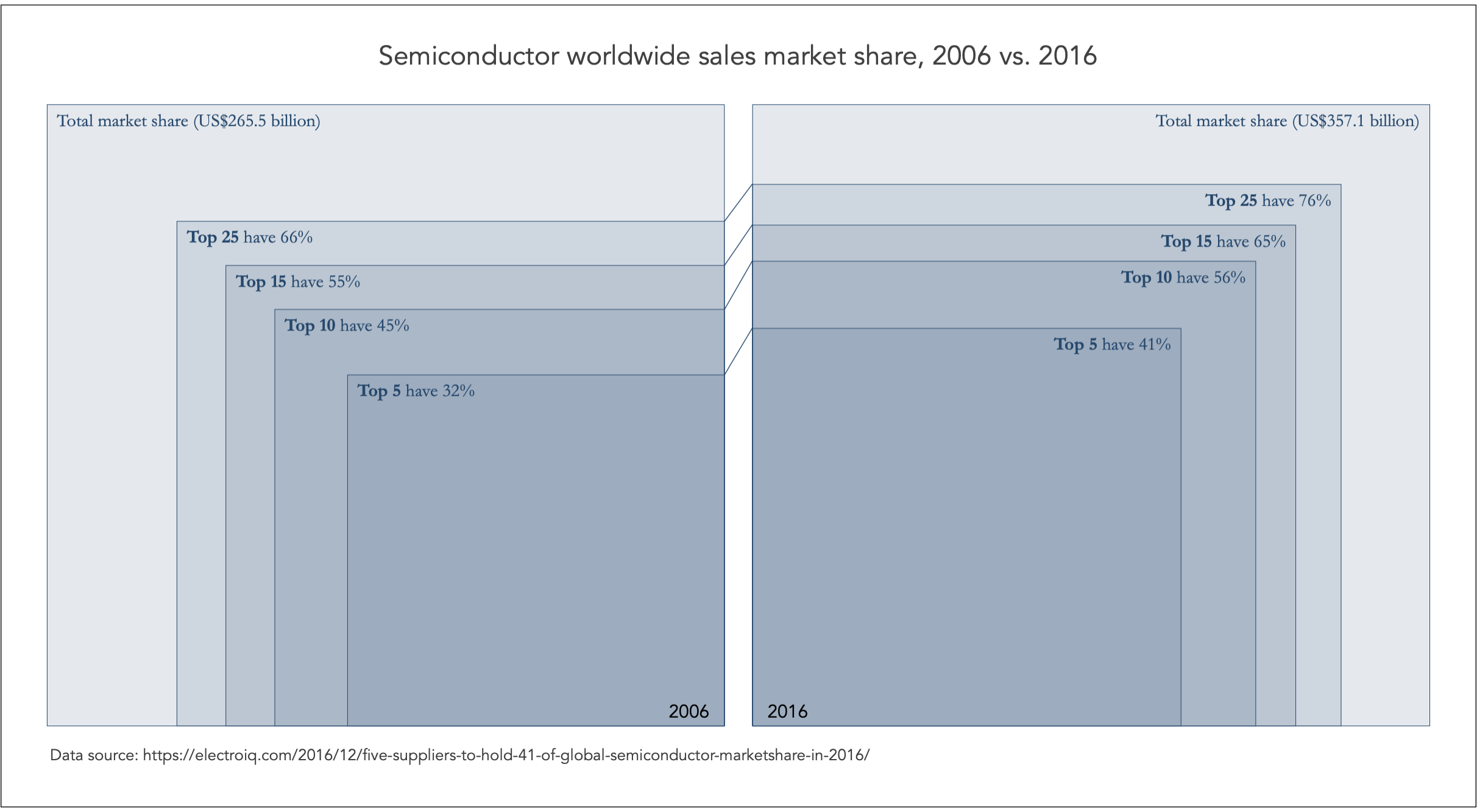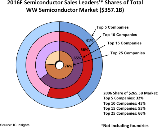The narrative is very interesting. The accompanying article explains how ongoing M&A activity has led to the fast consolidation of the semiconductor industry worldwide. In 2015, the top five companies (Intel, Samsung, Qualcomm, Broadcom, SK Hynix) held 32% of the global market share, and in just one year they increase their hold to 41%. If this is a trend that continues then there should be real concerns for increased prices.