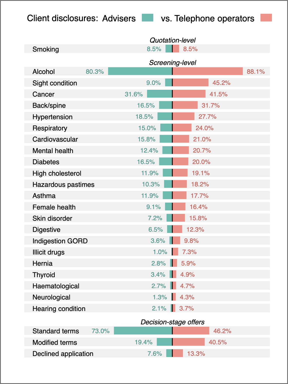 Only one disclosure is identical in both groups: smoking. A seasoned advisor knows that smoking disclosures inflate premiums by 25-50 per cent, depending on the product. Importantly, smoking is predominantly disclosed determined at the quotation level where baseline premiums are determined. This means that advisors receiving commission-based remuneration get a substantial lift in revenue when their clients admit smoking. However, with other medical and lifestyle disclosures at the screening-stage, the more that is disclosed the lower the probability that a customer will be offered a contract or that a contract will be desirable.