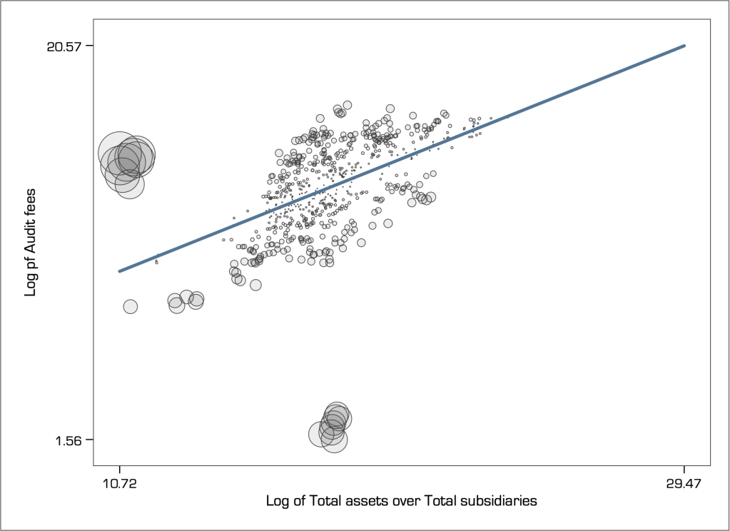 To demonstrate this effect, consider a random sample of audit fees paid by the top firms listed on the ASX, relative to the ratio of total assets over total subsidiaries. Total assets is a strong determinant of audit fees because it represents the size of the audit (i.e. the more assets the more work for the auditor). Total assets per subsidiary measure the average size of the audit relative to the complexity of having to go through the many subsidiaries to find this information: