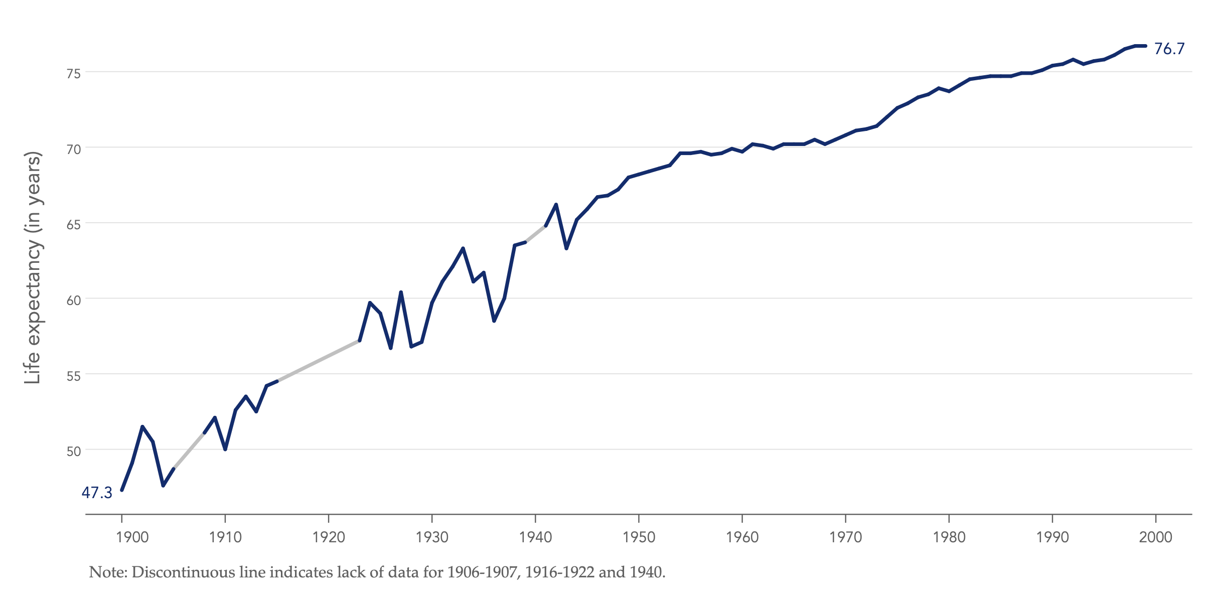 For those familiar with the life expectancy data, as I also show in the analysis on US life expectancy of males, during 1917-1918 there was a sharp drop in life expectancy due to the world pandemic of Spanish influenza killing 3-5% of Earth’s population at the time. Thus, drawing an imaginary straight line from 1918-1923 effectively discounts the possibility of a sharp change in life expectancy (or whichever is the measure of interest at hand).