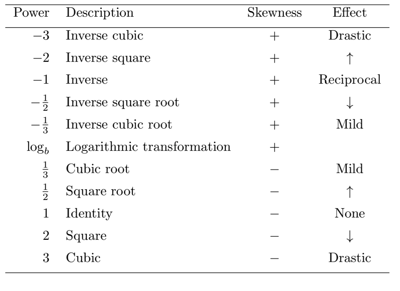 Tukey (1957) explains how the distribution of [0,+∞) variables can be transformed to near symmetry using power transformations. Specifically, positively skewed data can be symmetrically transformed using negative powers, and negatively skewed data can be symmetrically transformed using positive powers. The greater the skewness the larger the absolute degree of power required to compress the sparse values and spread out the condensed part of the density. Tukey (1957) calls this rule the ladder of powers, that can be summarised in the following table: