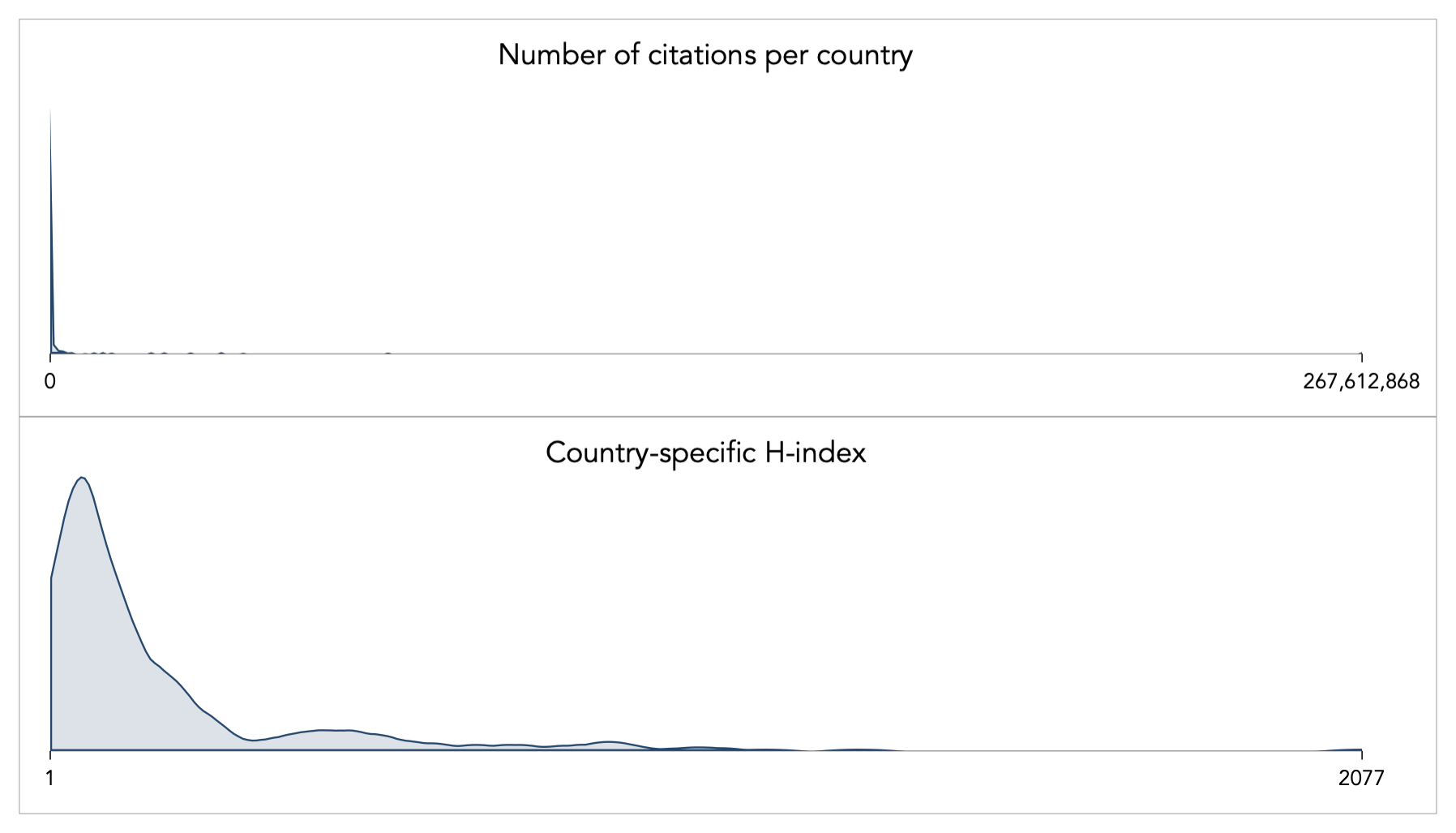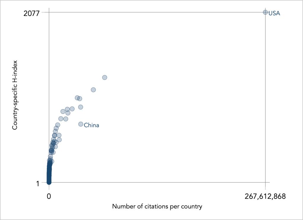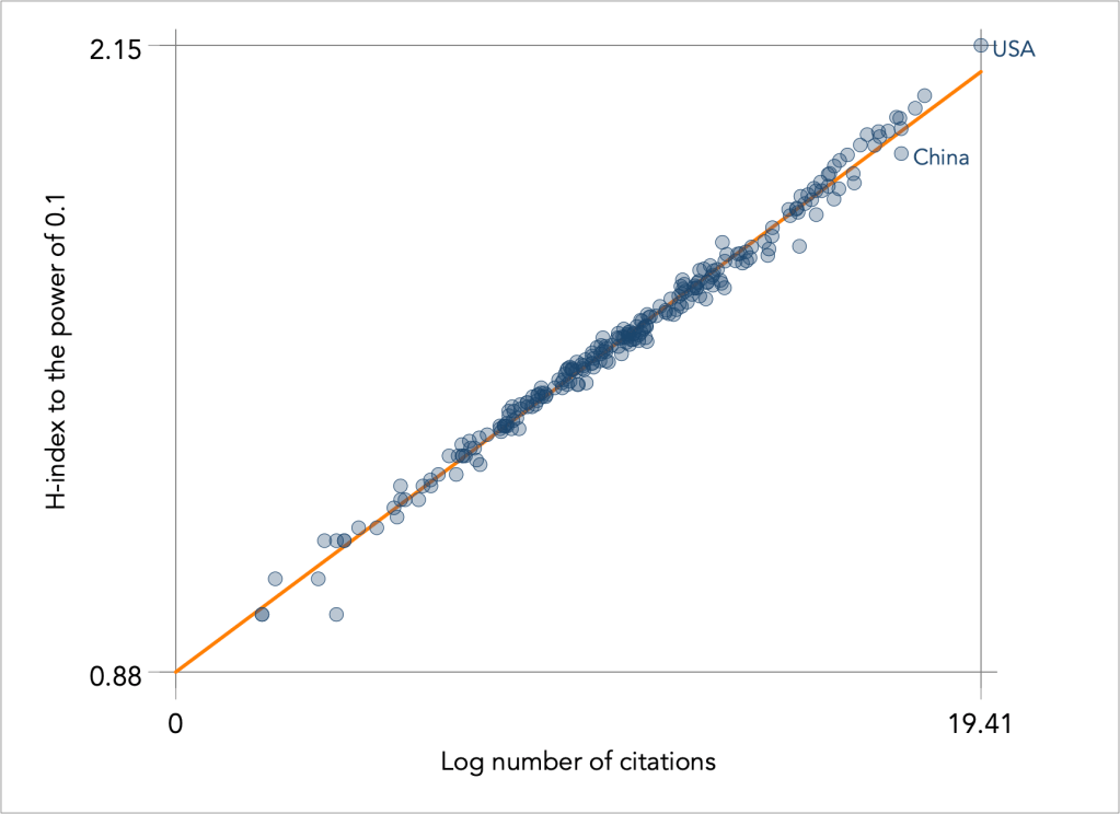 Let say, that we are interested in understanding how the number of scientific citations determine the H-index at the level of country. This relation using nominal values looks as follows: