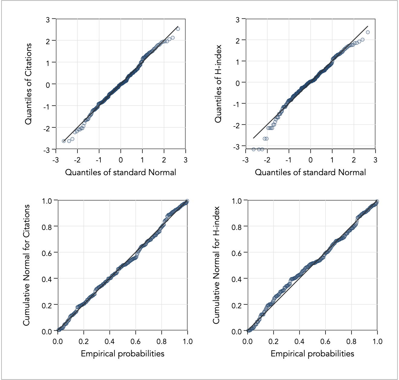 A more formal approach would be to apply the Box-Cox transformation as described above. We could solve that problem using Newton’s method. Stata’s bcskew0 command returns the power of λ=0.0071 for citations and λ=0.1015 for H-index, and this is a comforting result that corroborates the chosen transformations (remember that the power of near 0 has the effect of the log transformation).