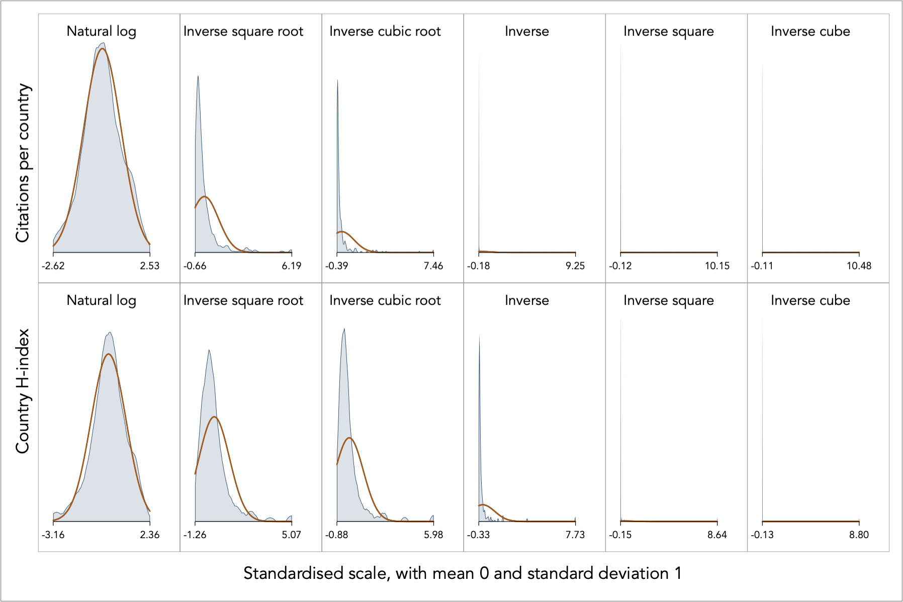 The superimposed orange line indicates the theoretical normal, following the standardisation of the variables. The log transformation for the citations per country appears to be spot on in turning the distribution into near Normal, whereas the rest of the transformations fail to produce a useful result. After all, only one transformation can succeed.