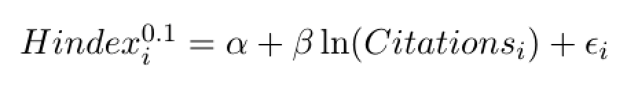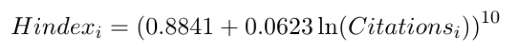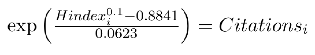 A policy maker can now say that an increase of citations by 1,000,000 would increase the H-index by 261.5. A Chinese policy maker could say that in order for China, with H-index 712, to reach the USA’s impact, with H index 2077, would need to attract another 153,292,942 citations from its published research (based on the increment of 2077 – 712=1365).