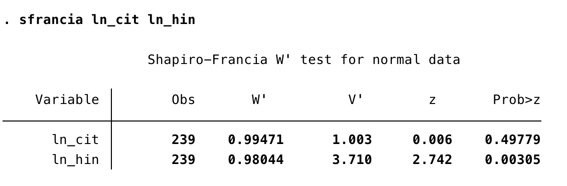 We cannot reject the hypothesis that the log-transformation of citations is normally distributed (variable ln_cit), but we reject the hypothesis for the log of country H-index (variable ln_hin).