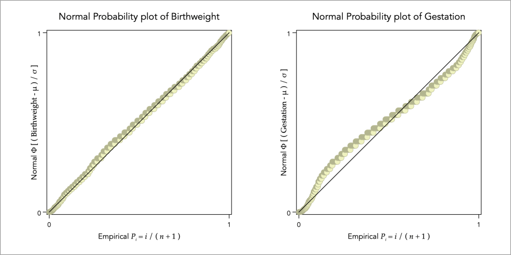 The NP-plot confirms that the birthweight distribution is not far from a normal distribution, but there is considerable deviations from normality for the distribution of gestation with negative skewness and high degree of kurtosis.
