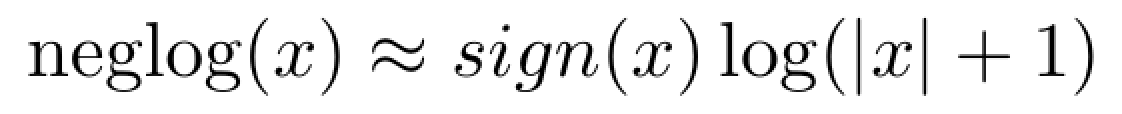 Another approach to transforming (–∞,+∞) variables is via trigonometric functions, the most popular being the inverse hyperbolic sine that maps onto the range [-709.77,709.77], and the inverse tangent which transforms the variable to the range [-π/2,π/2]. A notable application of the inverse hyperbolic sine is in the Johhson (1949) SU class of distributions (the subscript U stands for unbounded on both ends). Some like to describe the inverse tangent as the log-transformation for negative values because of similar effect.