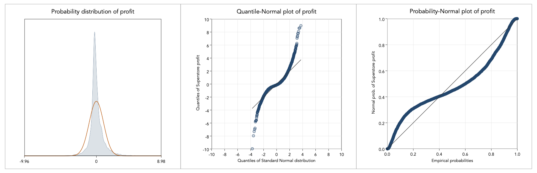 This is an awkward distribution and would be a challenge to transform. There is considerably kurtosis (at about 54.74). By the looks of the probability density plot and the quantile normal plot, I suspect that this is probably due to the fact that the Profit variable contains observation at different scales. Specifically, Profit is a variable that pools all transactions from a fictional superstore where profit is generally large for appliances, copiers and phones, but quite small for stationery and office supplies. To make this point, here is the tabulated frequencies of product subcategory with the mean and standard deviation of profit within for each subcategory (using Stata’s tabulate,summarize command):