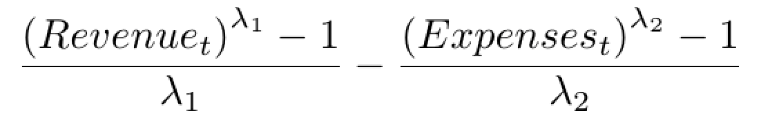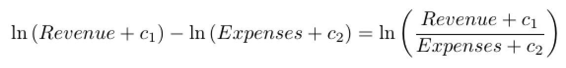 The constants c1 and c2 can be exploited to shift the distribution prior taking the log-transformation to achieve higher degree of symmetry. This ratio can be interpreted as the percentage rate of revenue relative to expenses. One could also apply the Box-Cox family of transformation to the source variables, as follows: