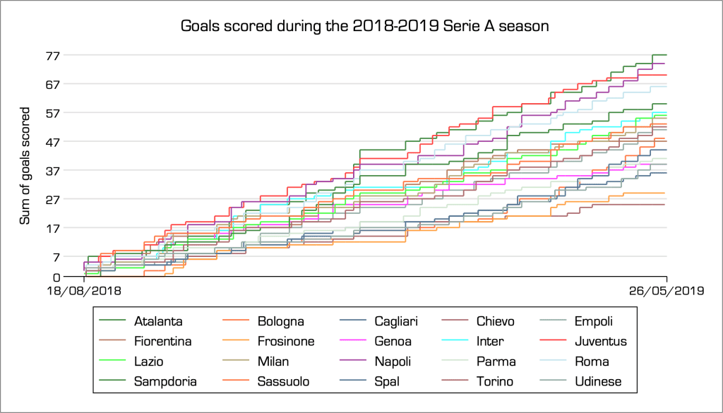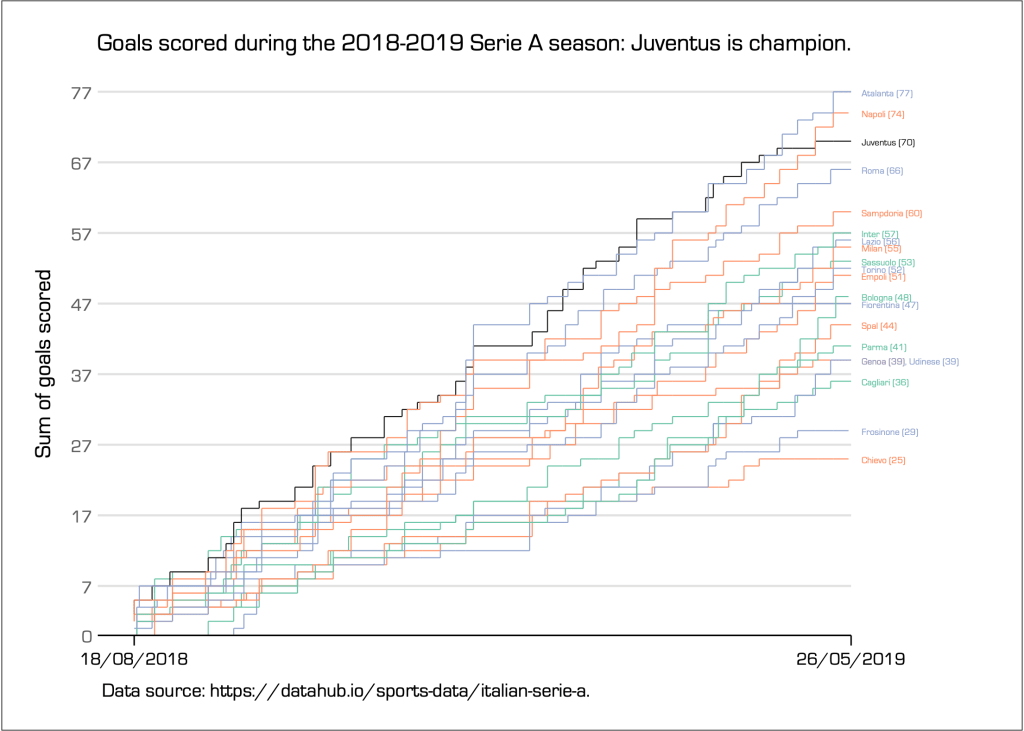 As an example, consider a line chart that shows the sum of goals scored by every soccer team participating in the Italian 2018-2019 Serie A season. There were 20 teams competing, and a legend approach would require encoding 20 different colours one for each line, and the then identifying each color with the respective name of the team in a legend, as for instance: