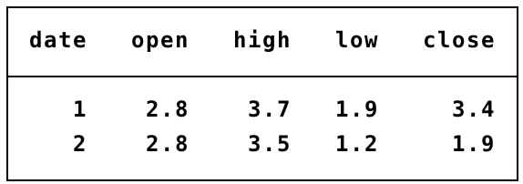 Consider the problem of the encoding the open price, close price, high price and low price of a security in two consecutive days. Consider the following demo dataset of just two observations: