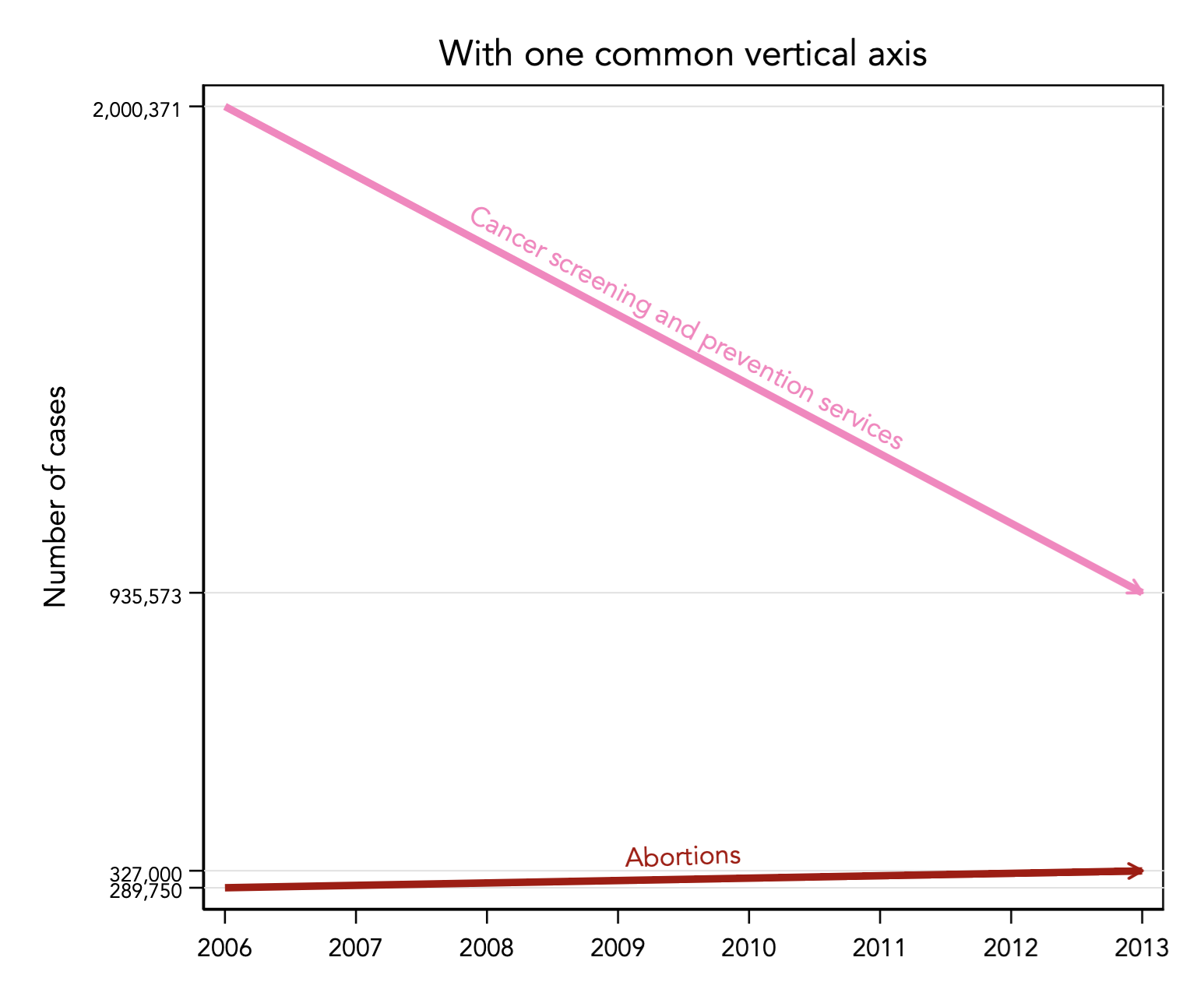 As another example of low decoding accuracy consider the following graph that was released by an anti-abortion group, Americans United for Life, which claims that during 2006-2013 abortions went up at a diametrically opposing rate as cancer screening and prevention services. This graph was also presented by Republican Rep. Jason Chaffetz to a congressional hearing. I reproduce this graph here: