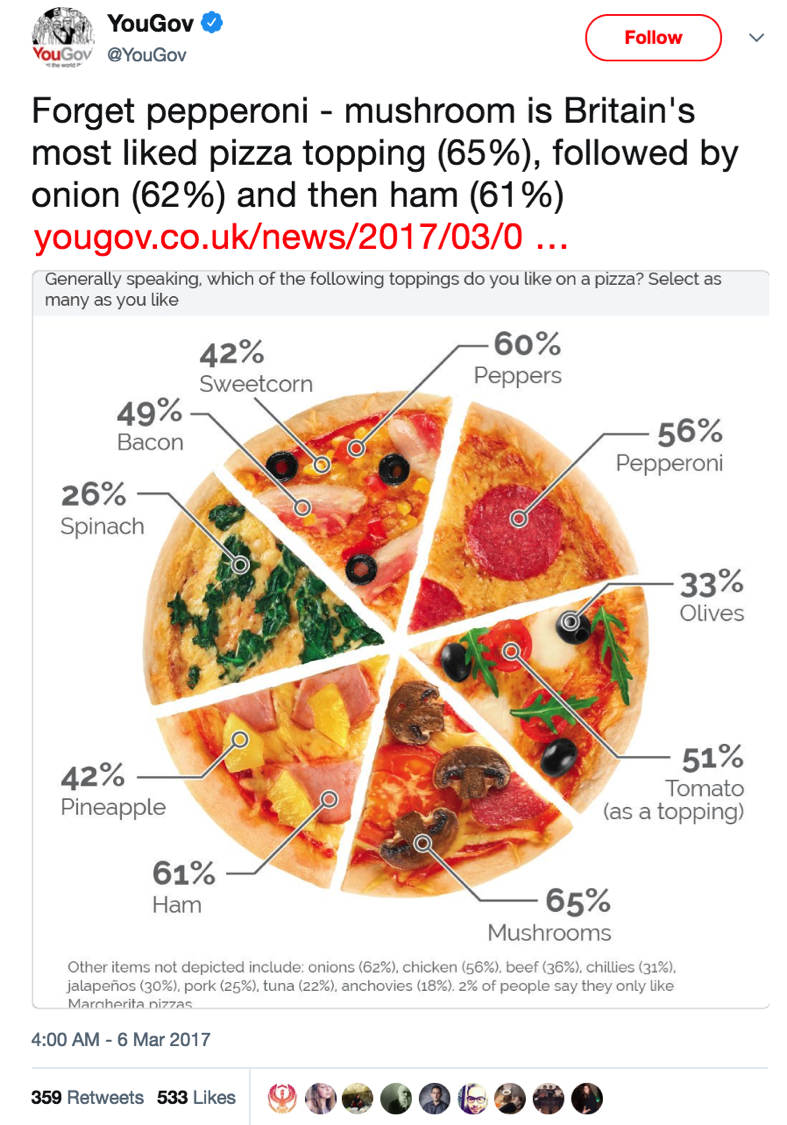 Any pictorial representations or using non-data elements have no place in scientific data graphs as they impair quick and accurate decoding. Any attempts to ‘beautify’ data graphs are misguided and amount to mere chart-junk. Here is an infamous example from YouGov.co.uk: