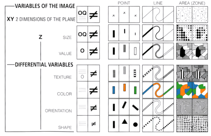 The row on Texture and its application on point, line and area visual implantations. This type of encoding method is now irrelevant, and has been superseded by the introduction of color in print and online publications. Notice how the row on Color offers a much more accurate and efficient encoding approach than texture.
